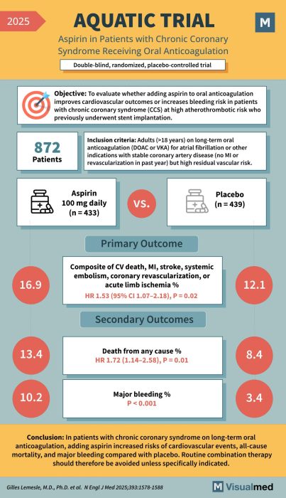 The AQUATIC trial (2025) was a double-blind, randomized, placebo-controlled study that evaluated the effect of adding aspirin to long-term oral anticoagulation in patients with chronic coronary syndrome (CCS) at high atherothrombotic risk. A total of 872 patients on oral anticoagulation … Read More