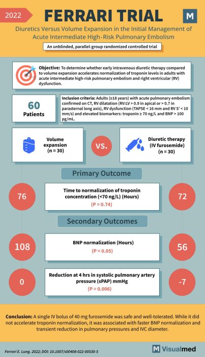 The FERRARI trial (2022) compared early intravenous diuretic therapy using 40 mg IV furosemide versus volume expansion in adults with acute intermediate high-risk pulmonary embolism (PE) and right-ventricular (RV) dysfunction. Sixty patients with CT-confirmed PE, RV dilatation, dysfunction, and elevated … Read More