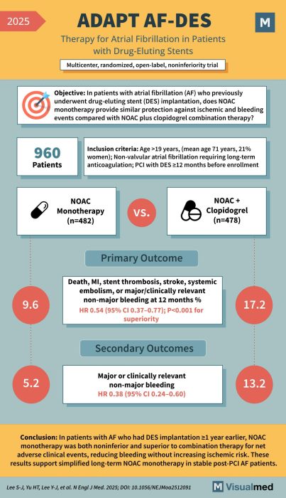 ADAPT AF-DES Trial (2025) Therapy for Atrial Fibrillation in Patients with Drug-Eluting StentsMulticenter, randomized, open-label, noninferiority trial Objective:In patients with atrial fibrillation (AF) who previously underwent drug-eluting stent (DES) implantation, does NOAC monotherapy provide similar protection against ischemic and bleeding … Read More