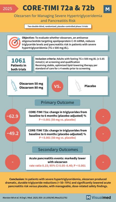Olezarsen for Managing Severe Hypertriglyceridemia and Pancreatitis RiskTwo double-blind, randomized, placebo-controlled phase 3 trials Objective:To evaluate whether olezarsen, an antisense oligonucleotide targeting apolipoprotein C-III mRNA, reduces triglyceride levels and pancreatitis risk in patients with severe hypertriglyceridemia (TG ≥ 500 mg/dL). … Read More