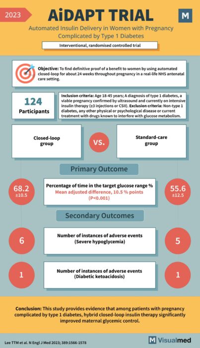 Year: 2023 Title: AiDAPT TRIAL Subtitle: Automated Insulin Delivery in Women with Pregnancy Complicated by Type 1 Diabetes Type of Trial: Interventional, randomized controlled trial Objective: To find definitive proof of a benefit to women by using automated closed-loop for … Read More