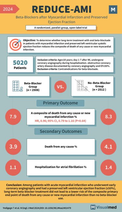 Year: 2024 Title: REDUCE-AMI Subtitle: Beta-Blockers after Myocardial Infarction and Preserved Ejection Fraction Type of Trial: A randomized, parallel-group, open-label trial Objective: To determine whether long-term treatment with oral beta-blockade in patients with myocardial infarction and preserved left ventricular systolic … Read More