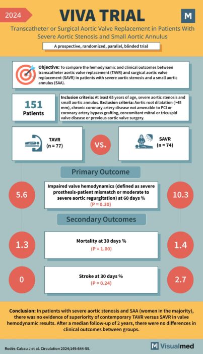The infographic summarizes the VIVA TRIAL as follows: Year: 2024 Title: VIVA TRIAL Subtitle: Transcatheter or Surgical Aortic Valve Replacement in Patients With Severe Aortic Stenosis and Small Aortic Annulus Type of Trial: A prospective, randomized, parallel, blinded trial Objective: … Read More