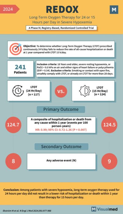 REDOX Trial: Long-Term Oxygen Therapy for 24 or 15 Hours per Day in Severe Hypoxemia The REDOX trial is a phase IV, registry-based, randomized controlled study that examines whether long-term oxygen therapy (LTOT) for 24 hours per day provides better … Read More