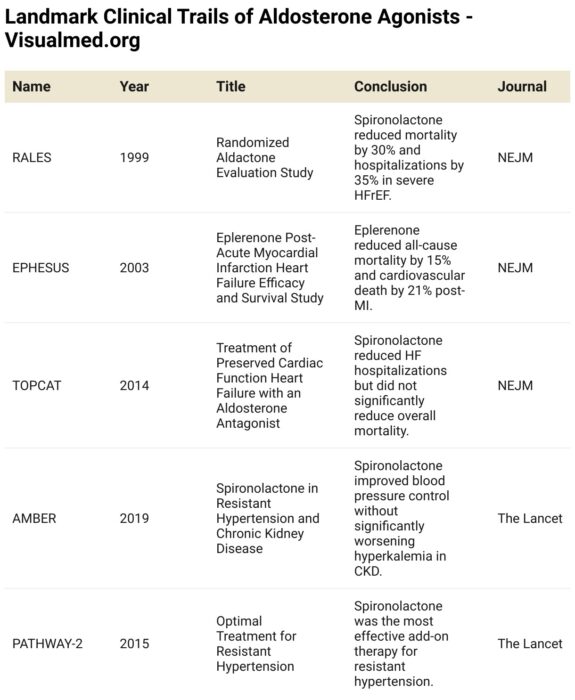 landmark clinical trials focusing on aldosterone antagonists (mineralocorticoid receptor antagonists) like spironolactone and eplerenone, which are commonly used in heart failure and other conditions: 1. RALES (1999) • Title: Randomized Aldactone Evaluation Study • Focus: Heart failure with reduced ejection … Read More