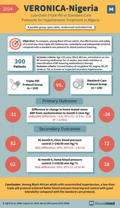The VERONICA-Nigeria trial, published in JAMA in 2024, evaluated the efficacy and safety of a low-dose triple-pill protocol (telmisartan, amlodipine, and indapamide) versus a standard-care protocol for managing hypertension in Black African adults. This parallel-group, open-label, randomized controlled trial involved … Read More