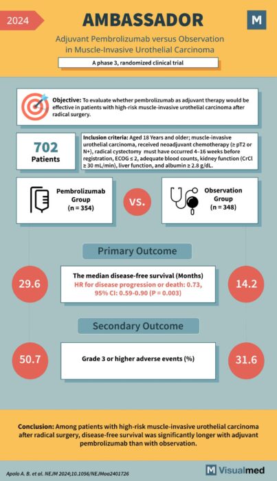 The AMBASSADOR trial is a phase 3 randomized clinical trial aimed at evaluating whether pembrolizumab as adjuvant therapy is more effective than observation in patients with high-risk muscle-invasive urothelial carcinoma after radical surgery. Study Details: Inclusion Criteria: Primary Outcome: Secondary … Read More