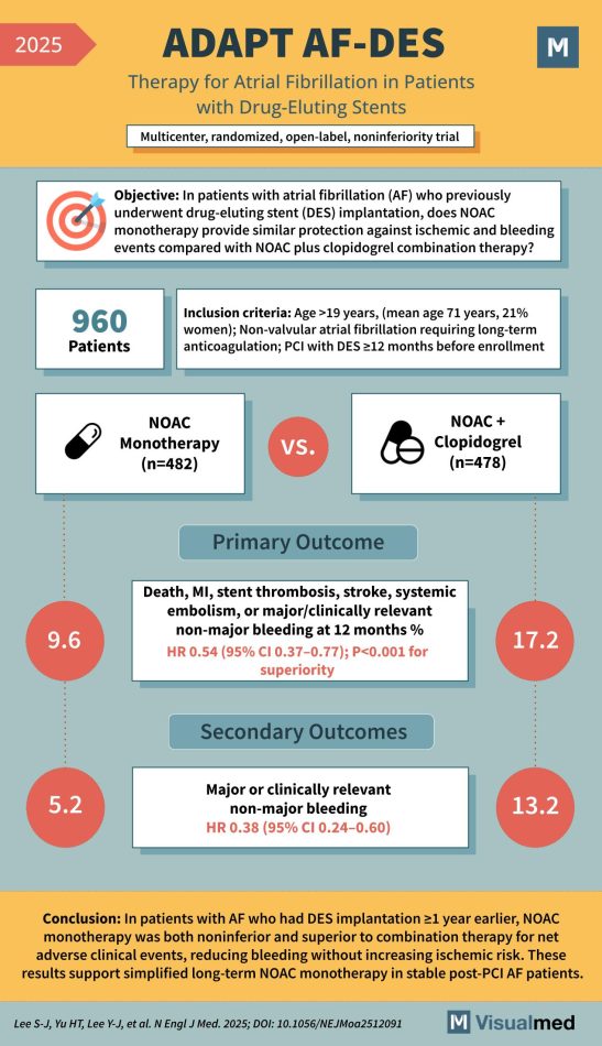 ADAPT AF-DES Trial (2025) Therapy for Atrial Fibrillation in Patients with Drug-Eluting StentsMulticenter, randomized, open-label, noninferiority trial Objective:In patients with atrial fibrillation (AF) who previously underwent drug-eluting stent (DES) implantation, does NOAC monotherapy provide similar protection against ischemic and bleeding … Read More
