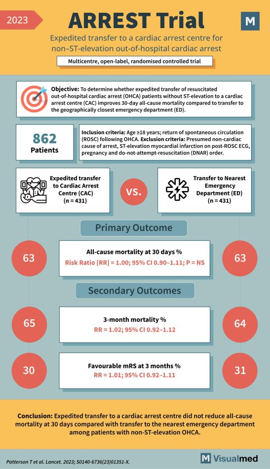 The ARREST Trial (2023) was a multicenter, open-label, randomized controlled study that assessed whether expedited transfer of resuscitated out-of-hospital cardiac arrest (OHCA) patients without ST-elevation to a cardiac arrest center (CAC) improved outcomes compared with transfer to the nearest emergency … Read More