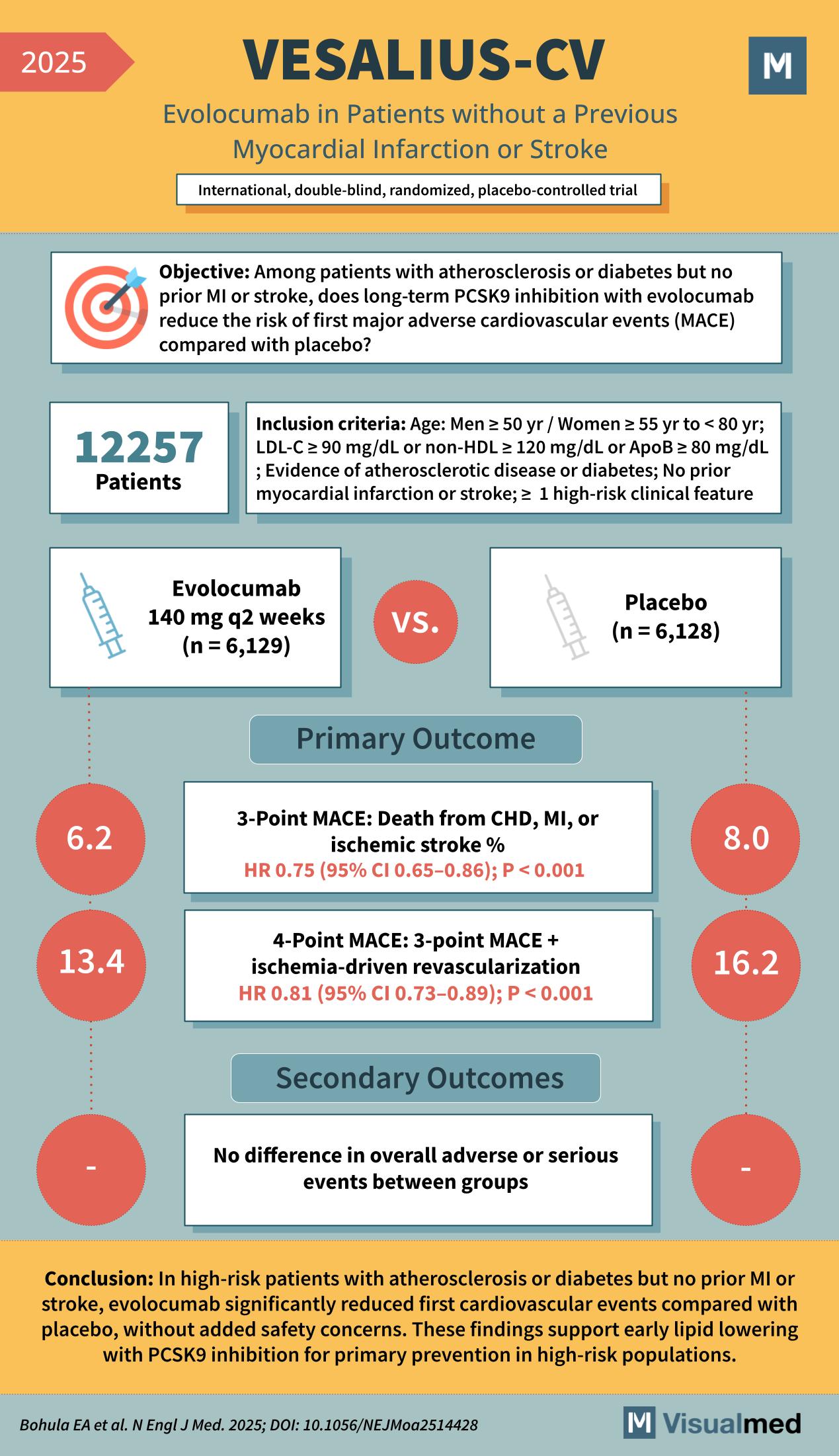VESALIUS-CV Trial (2025) Evolocumab in Patients without a Previous Myocardial Infarction or StrokeInternational, double-blind, randomized, placebo-controlled trial Objective:Among patients with atherosclerosis or diabetes but no prior MI or stroke, does long-term PCSK9 inhibition with evolocumab reduce the risk of first … Read More
